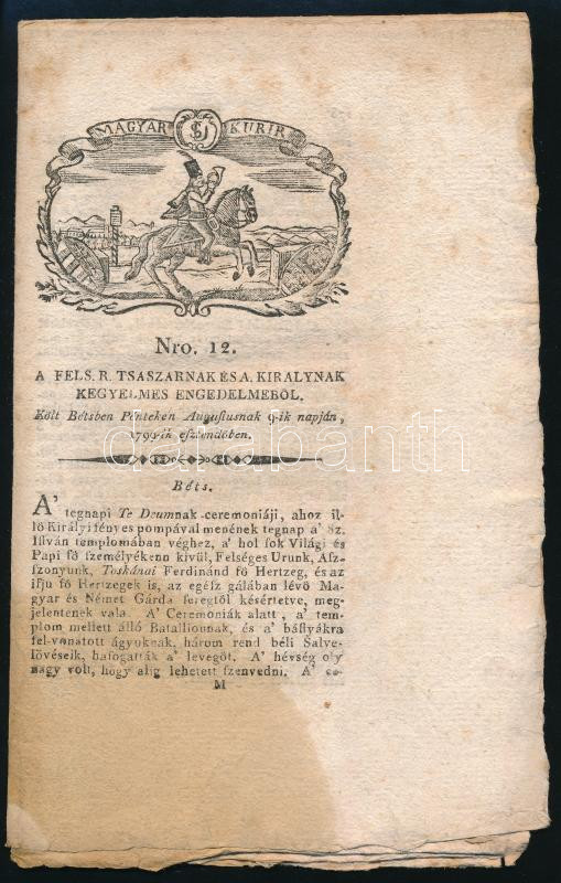 1799.VIII.9 A Magyar Kurír 12. száma, foltos https://www.darabanth.com/hu/465-Gyorsarveres/465.0/Mutargy-papirregiseg-egyeb/Nyomtatvanyok~1000012/1799VIII9-A-Magyar-Kurir-12-szama-foltos~II3131793