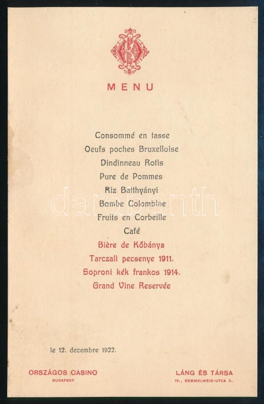 1922 Országos Casino, Láng és Tsa Budapest menükártya, kissé foltos https://www.darabanth.com/hu/465-Gyorsarveres/465.0/Mutargy-papirregiseg-egyeb/Nyomtatvanyok~1000012/1922-Orszagos-Casino-Lang-es-Tsa-Budapest-menukartya-kisse-foltos~II3132791
