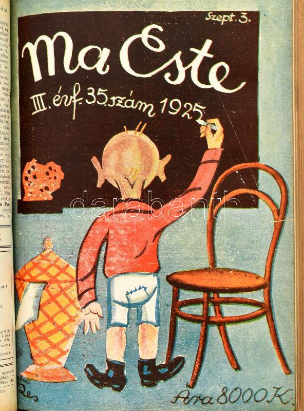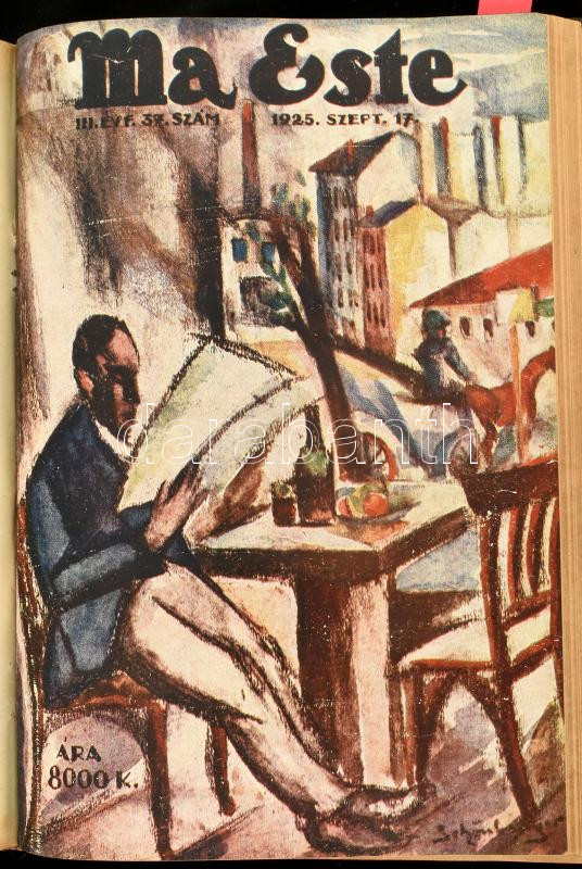 1925 Ma Este. Képes heti revü. III. évf. 34-40. sz. Korabeli egészvászon kötésben, a többek közt Schönberger Armand és Csabai Ékes Lajos által rajzolt papírborítókat bekötötték, sérült gerinccel, kopott borítóval első néhány lap foltos, néhány kevés lapon apró sérülésekkel, kisebb szakadásokkal.