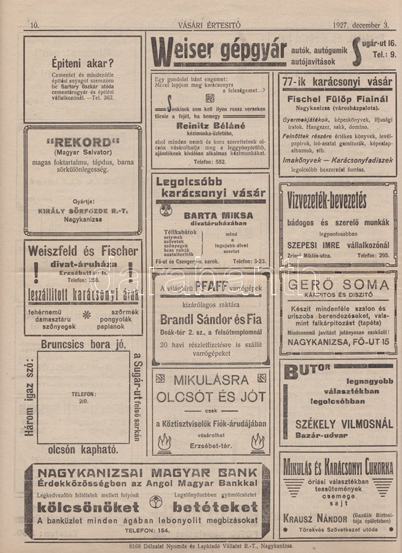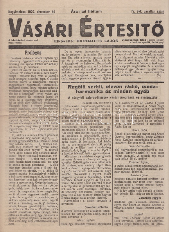 1927 Vásári értesÃtÅ‘. Elkövette: Barbarits Lajos. IV. Évfolyam, páratlan szám. (1927. december hó.)