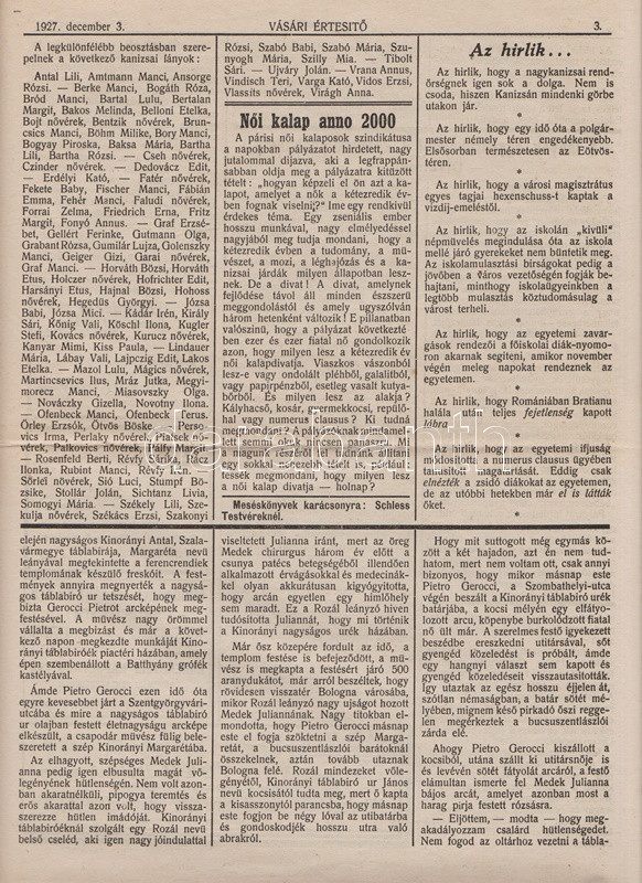 A Vásári ÉrtesÃtÅ‘ a nagykanizsai Keresztény Jótékony NÅ‘egylet által szervezett karácsonyi vásáron terjesztett humoros idÅ‘szaki kiadvány, szabadáras termék, melynek bevételét a vásári tombola bevételéhez hasonlóan jótékony célra fordÃtották. Dokumentumunk ismerteti a NÅ‘egylet az évi vásári programját, illetve humoros cikkeket közöl. Az utolsó oldalakon korabeli apróhirdetések.