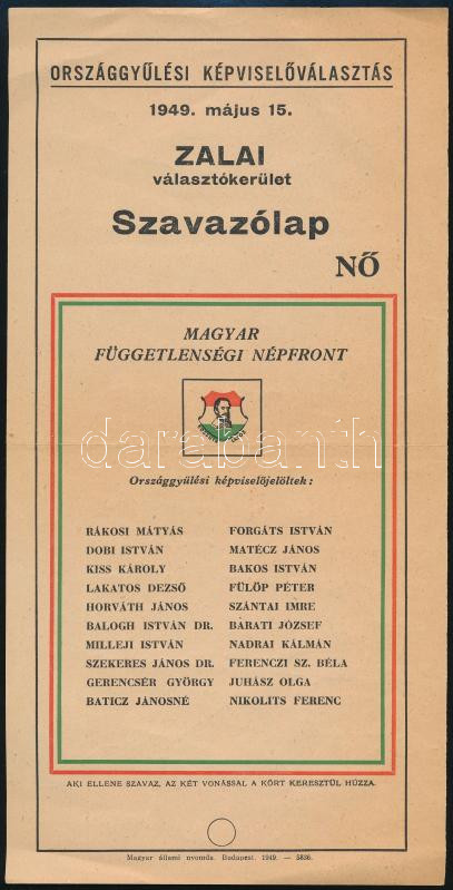 1949 Országgyűlési képviselőválasztás, zalai választókerület, női szavazólap, a Magyar Függetlenségi Népfront képviselőjelöltjeinek listájával (Rákosi Mátyás, Dobi István, stb.), Bp., Magyar állami-ny., jó állapotban, 28x14 cm