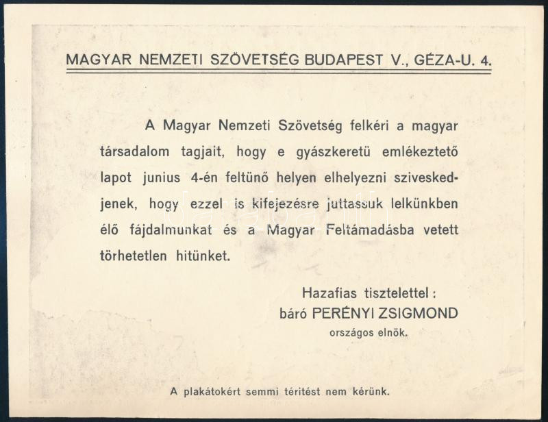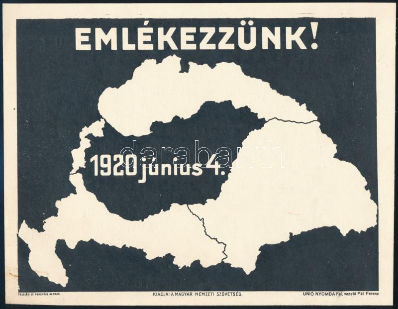 ca 1921 Magyar Nemzeti Szövetség Emlékezzünk. Irredenta plakát. Karton... https://www.darabanth.com/hu/465-Gyorsarveres/465.0/Mutargy-papirregiseg-egyeb/Nyomtatvanyok~1000012/ca-1921-Magyar-Nemzeti-Szovetseg-Emlekezzunk-Irredenta-plakat-Karton-22x17-cm~II3135180