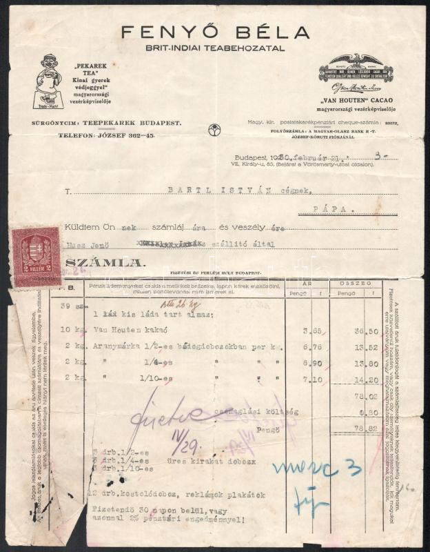 Leírás: 1930 Fenyő Béla Brit-Indiai Teabehozatal - Pekarek Tea, Van Houten Cacao magyarországi vezérképviselet fejléces számla, nagyobb beszakadás