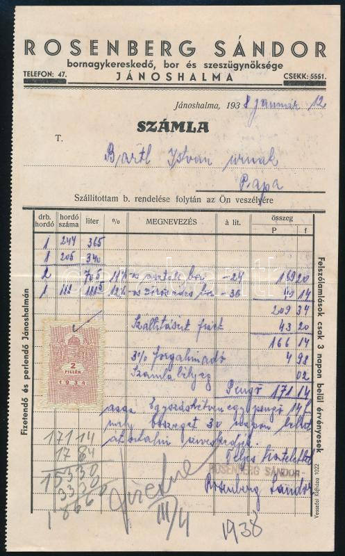Leírás: 1938 Jánoshalma, Rosenberg Sándor Borkereskedő, Bor és Szesz Ügynöksége fejléces számla asztali / vörös édes bor tárgyában