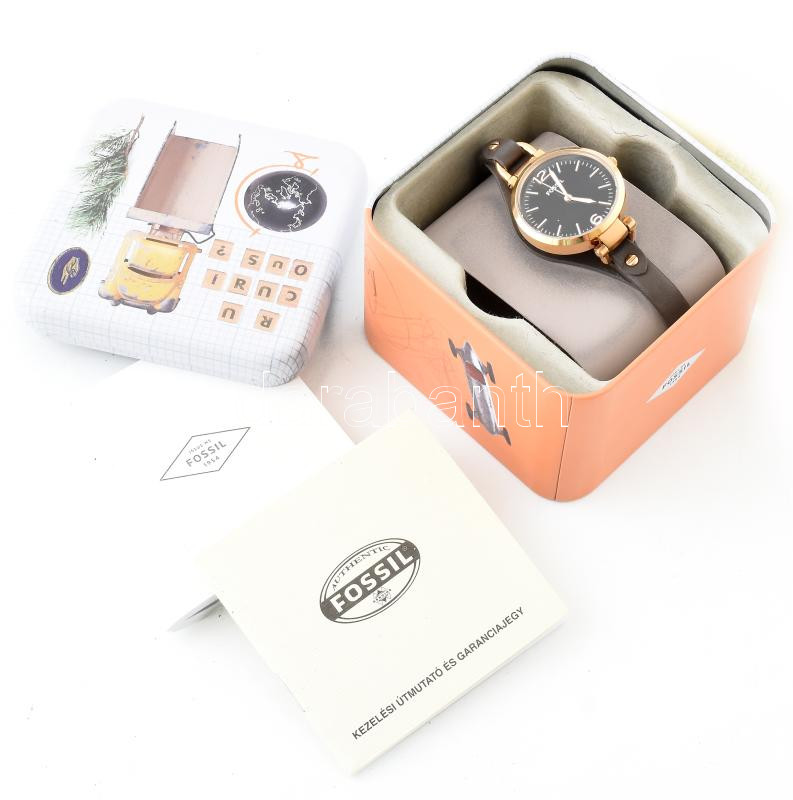 Leírás: Fossil női kvarc karóra eredeti dobozában, leírással, bőr szíjjal. Elemcserére szorul, szép állapotban. d: 32 mm