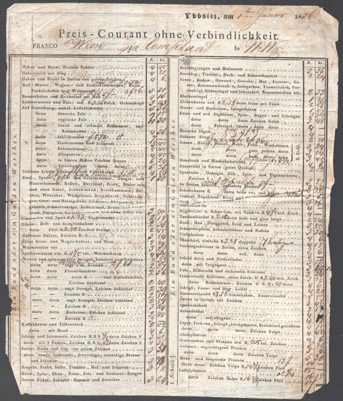 1836 Ybbsitz (Ausztria), szerszámok, konyhai eszközök, stb. német nyelvű árjegyzéke, kézzel beírt árakkal, kétoldalas, kisebb lapszéli sérülésekkel, 26x22 cm