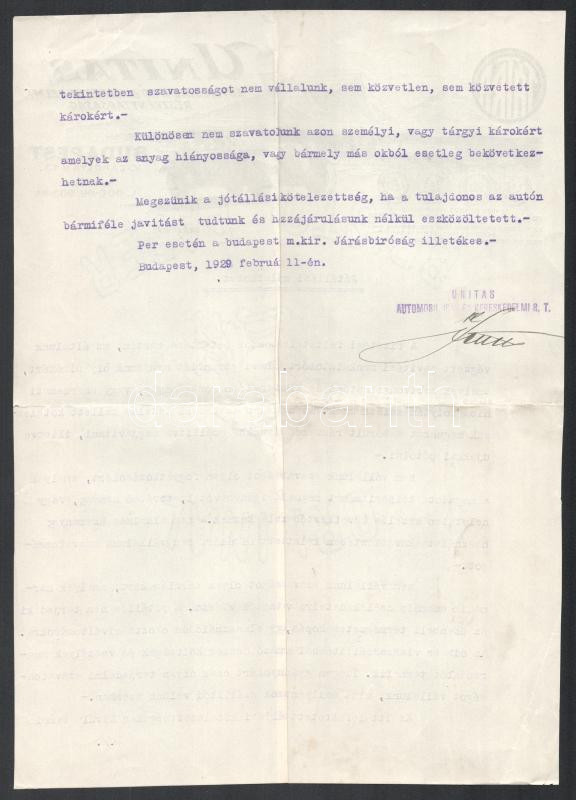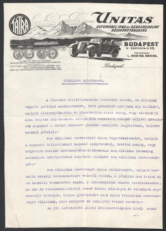Leírás: 1929 Tátra teherautó Unitas automobil ipari és kereskedelmi rt. fejléces számla