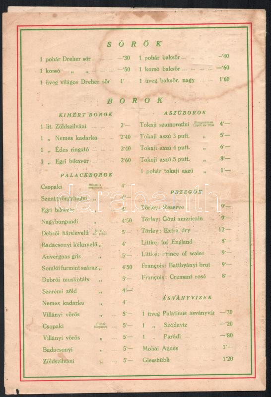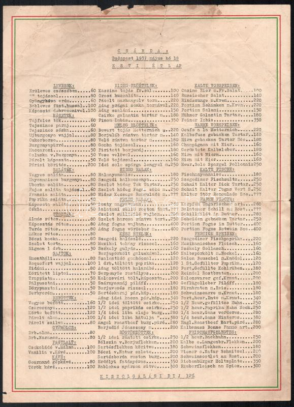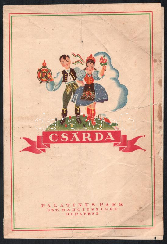 Leírás: 1937 Palatinus Park. Szt. Margitsziget Csárda esti étlap. Bp., Rigler-ny., 1937. május 18., népies grafikával díszített, szakadt, kissé foltos, hajtott.