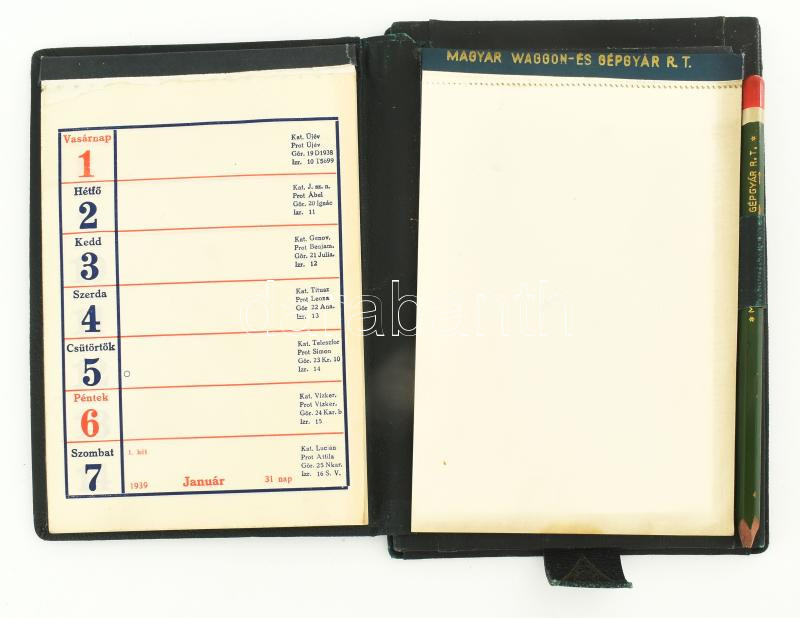 1939 Magyar Waggon- és Gépgyár R.T. naptár/határidőnapló és jegyzetfüz... https://www.darabanth.com/hu/465-Gyorsarveres/465.0/Mutargy-papirregiseg-egyeb/Reklam~1000001/1939-Magyar-Waggon-es-Gepgyar-RT-naptarhataridonaplo-es-jegyzetfuzet-alul-kihuzhato~II3133718