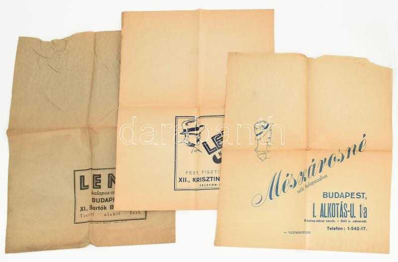 Leírás: 3 db reklám papírzacskó, Mészárosné női kalapszalon és Lenz kalaposmester, változó állapotban, 50x40 cm körül