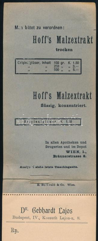 Leírás: Gebhardt Lajos (1836-1908), Budapest székesfőorvos tiszti főorvosának kitöltetlen recepttömbje, dekoratív szecessziós papírborítóval, borító belsején Hoff's Malzextrakt reklámmal.
