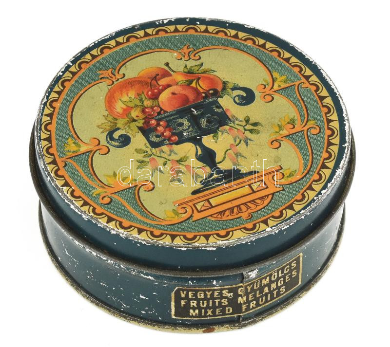 Leírás: Globus Weiss Manfred vegyes gyümölcs fémdoboz, kopással, d: 8,5 cm