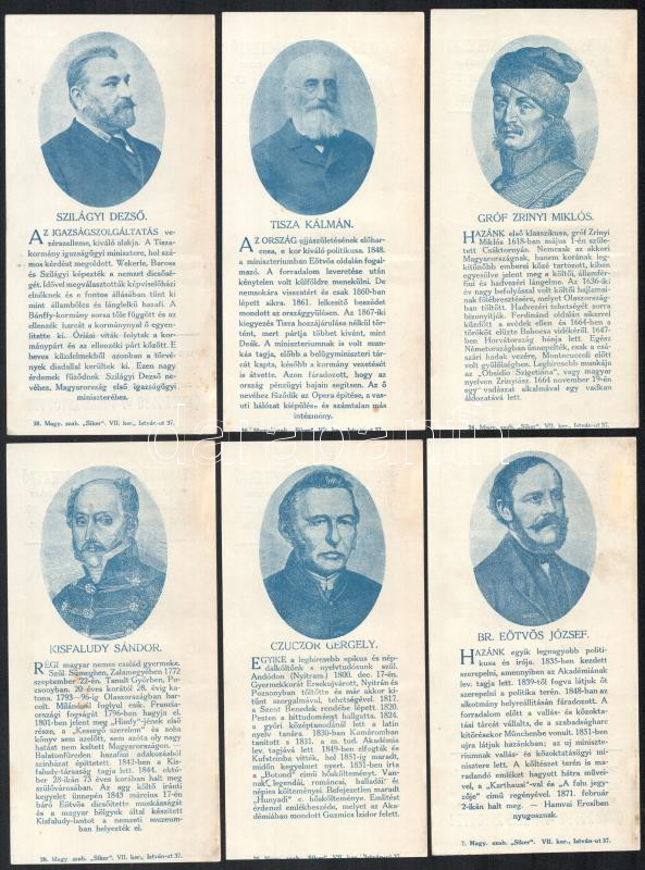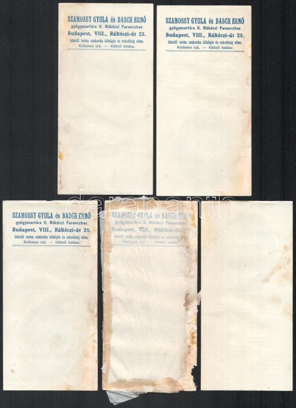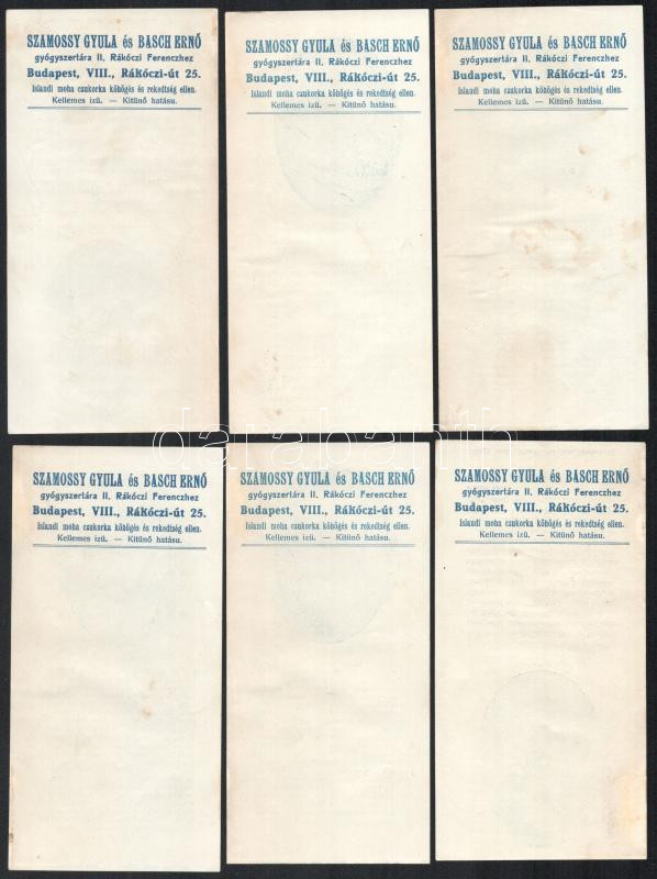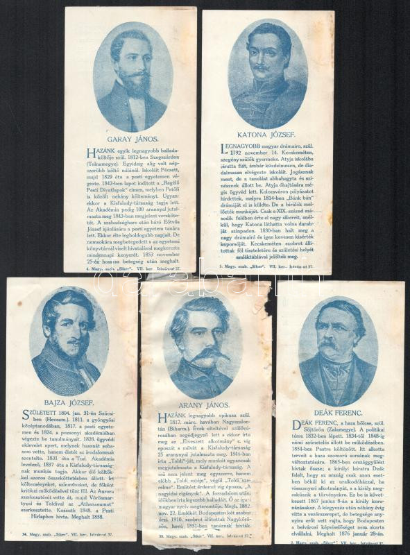 Szamosi Gyula és Basch Ernő Gyógyszertára számolócédulák, 10 db, rajta neves magyar írók arcképével. Közte: Szilágyi Dezső, Tisza Kálmán, Gróf Zrínyi Miklós, Kisfaludy Sándor, Czuzor Gergely, Eötvös József, Garay János, Katona József, Bajza József, Arany János. Az Arany János arcképes számolócédula hátoldalára papír ragadt, foltos. + Deák Ferencet ábrázoló számolócédula, de a hátoldaláról hiányzik Szamosi és Basch arcképe.