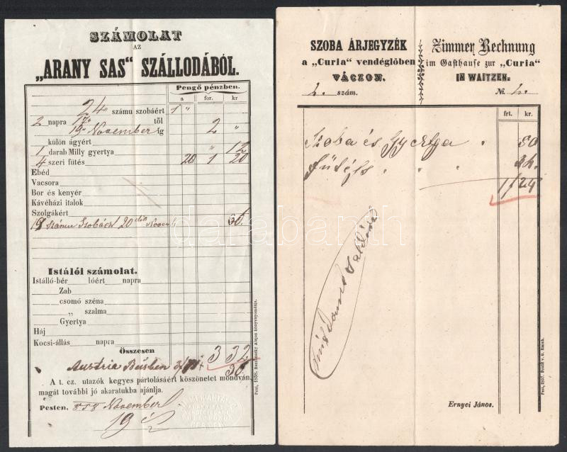 Leírás: ca 1850 2 db régi számla Vác, Curia vendéglő szoba számla, Arany Sas szálloda Pest