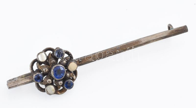 Leírás: Antik ezüst (Ag) bross, gyöngyház és drágakő ékítéssel. XIX. sz. eleje 6 cm br 4,55 g
