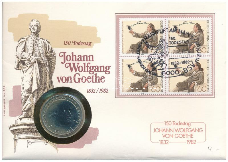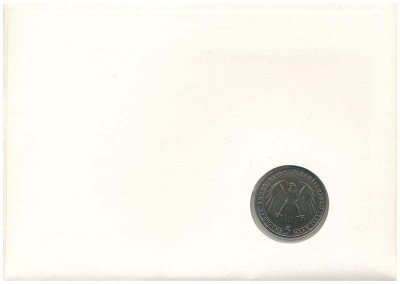 NSZK 1982D 5M Cu-Ni "Johann Wolfgang von Goethe" érme felbélyegzett borítékban, alkalmi bélyegzéssel T:UNC FRG 1982D 5 Mark Cu-Ni "Johann Wolfgang von Goethe" coin in envelope with stamp and cancellation C:UNC