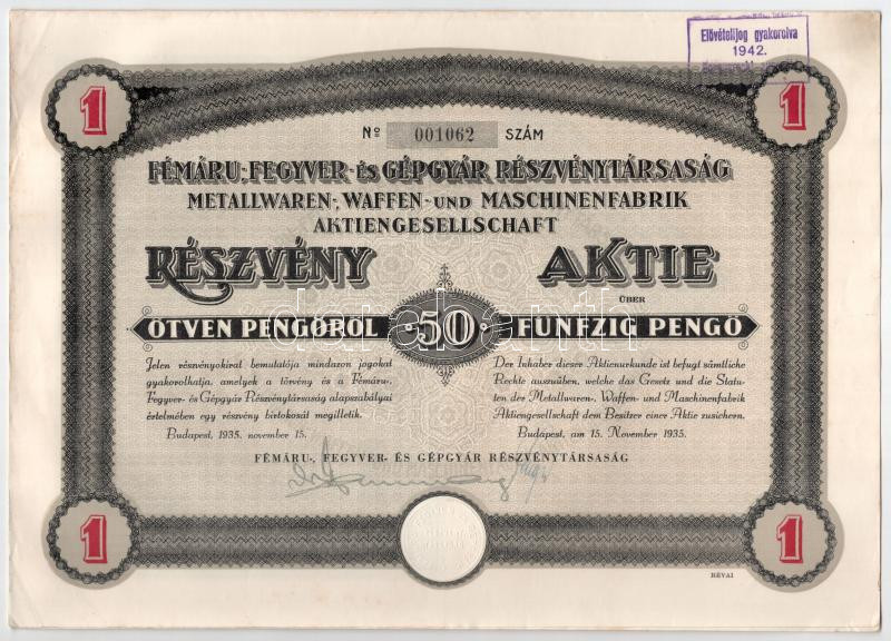 Budapest 1935. "Fémáru-, Fegyver és Gépgyár Részvénytársaság" részvénye 50P-ről német és magyar nyelven, szelvényekkel, bélyegzéssel és szárazpecséttel (3x sorszámkövetők) T:AU