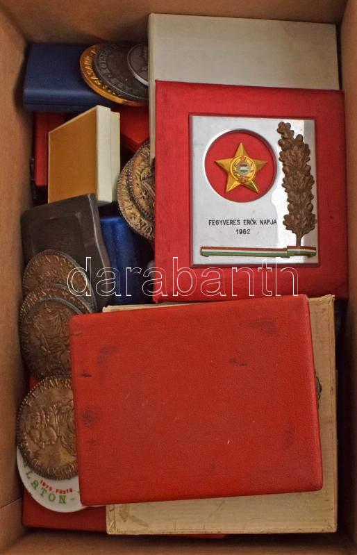 Leírás: Egy nagy doboznyi, magyar és külföldi, főleg szocialista emlékérem, plakett tétel, közte néhány üres tok és kitüntető jelvény T:vegyes