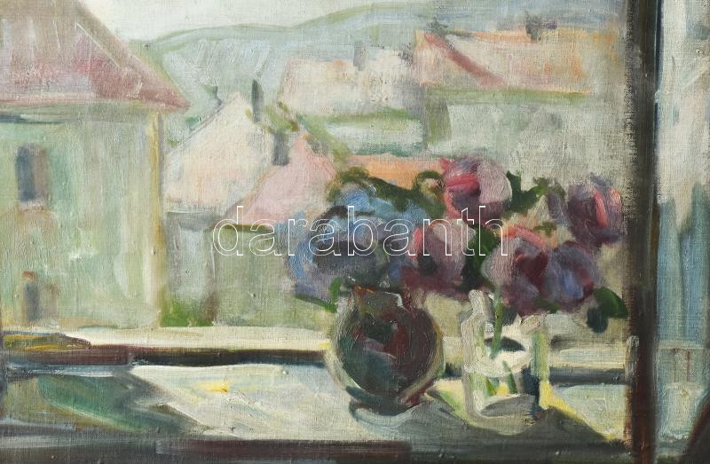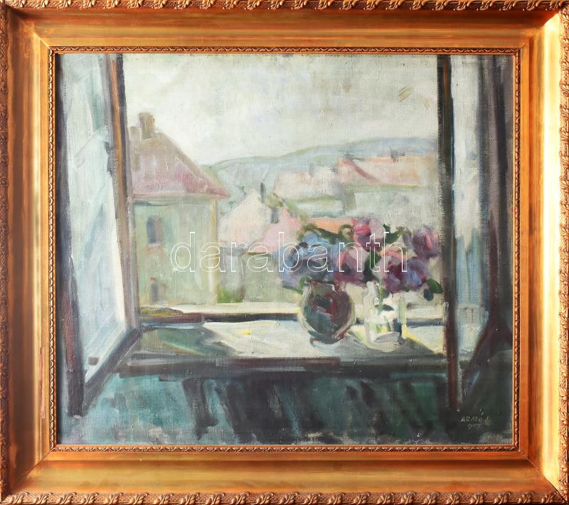 Leírás: Arató István (1922 - 2010): Bazsarózsa ablakban. Olaj, vászon, jjl.: Arató I. 957. Kissé sérült! 60x70 cm, keretben, sérült.