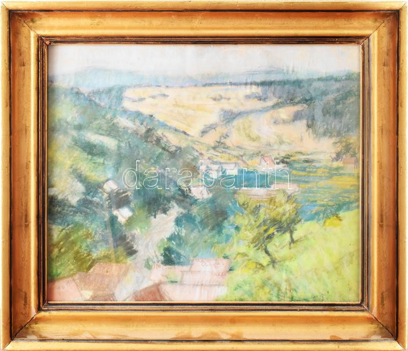 Leírás: B. Séday Mária (1925-2009): Dombos táj. Pasztell, papír, jjl.: B. Séd. 40x50 cm, keretben, üvegezett, kis sérüléssel.