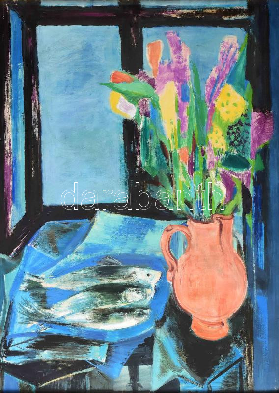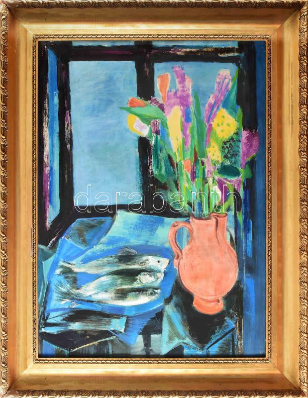 Leírás: Bartha László (1902-1958): Halas csendélet. Olaj, karton, jjl: Bartha László 1958. 70x50 cm, keretezett, keret sérült, kép jó állapotban.