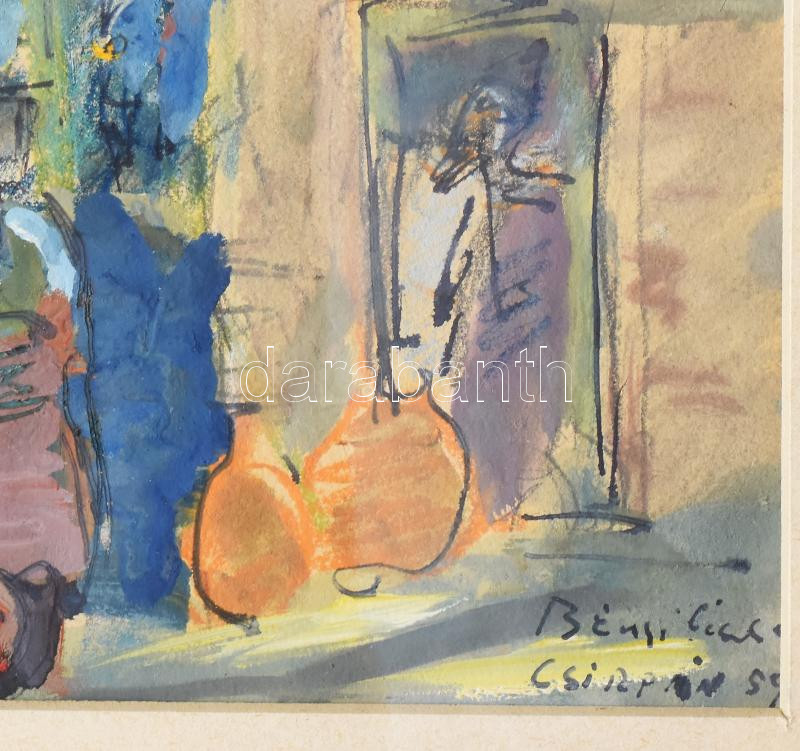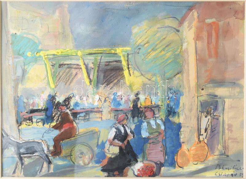 Leírás: Bényi László (1909-2004): Piaci jelenet. Vegyes technika, papír, jjl: Bényi László Csirpán 59. 23x32,5 cm, keretben, üvegezett, kis sérüléssel.