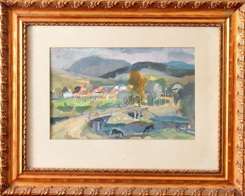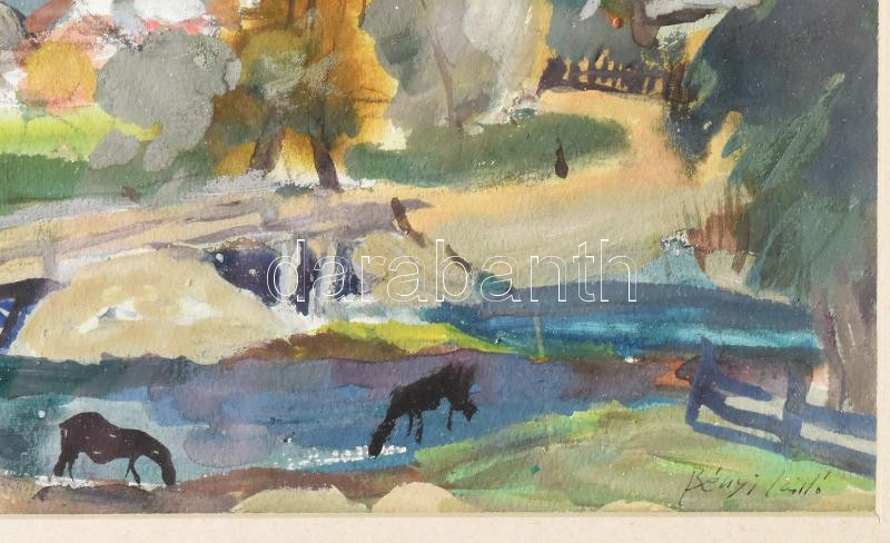Leírás: Bényi László (1909-2004): Zsögödi táj lovakkal. Tempera, papír, jbl.: Zsögöd 955. jjl: Bényi László. 18x29 cm, keretben, üvegezett, kis sérüléssel.