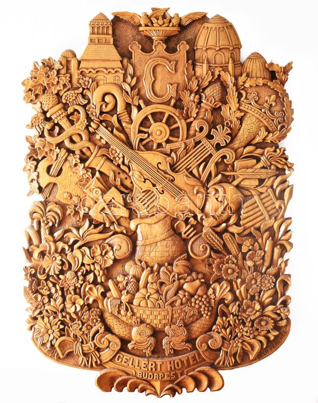 Leírás: Ferencz Béla (1922- ): Gellért Hotel montázs. Fafaragás, jjl.: California Béla Ferencz 91. 113x80 cm, jó állapotú.