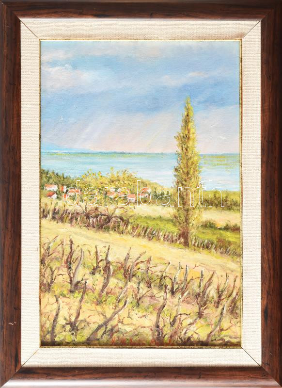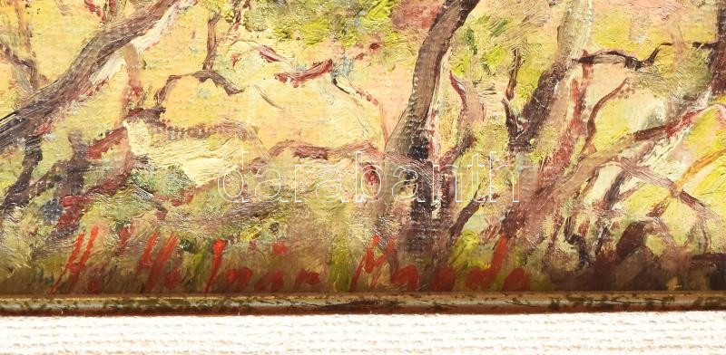 Leírás: H. Molnár Magda (1935-): Koratavasz (Alsóörs). Olaj, kartonra kasírozott vászon, jjl.: H. Molnár Magda. 44x29 cm, keretben, sérült.