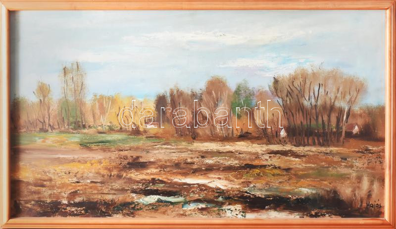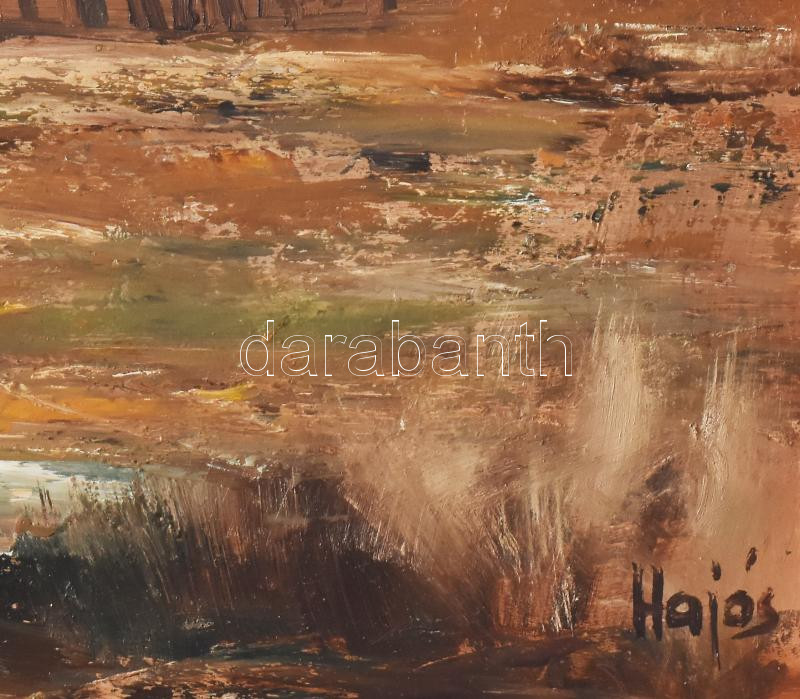 Leírás: Hajós Hollanda Éva (1935-): Tanyavilág. Olaj, farost, jjl.: Hajós. 40x70 cm, keretezett, jó állapotú.