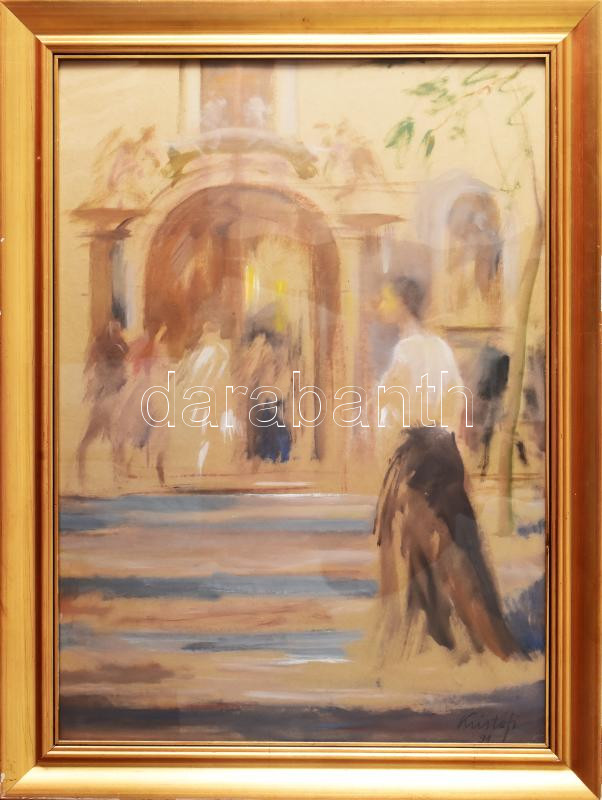 Kristófi János (1925-): Hölgy templomkapunál. Akvarell, papír, jjl.: K... https://www.darabanth.com/hu/466-Gyorsarveres/466.0/Gellert-Szallo-festmenyeinek-arverese/Gellert-Szallo-festmenyeinek-arverese~24/Kristofi-Janos-1925-Holgy-templomkapunal-Akvarell-papir-jjl-Kristofi-91-70x50-cm-ke~II3135422