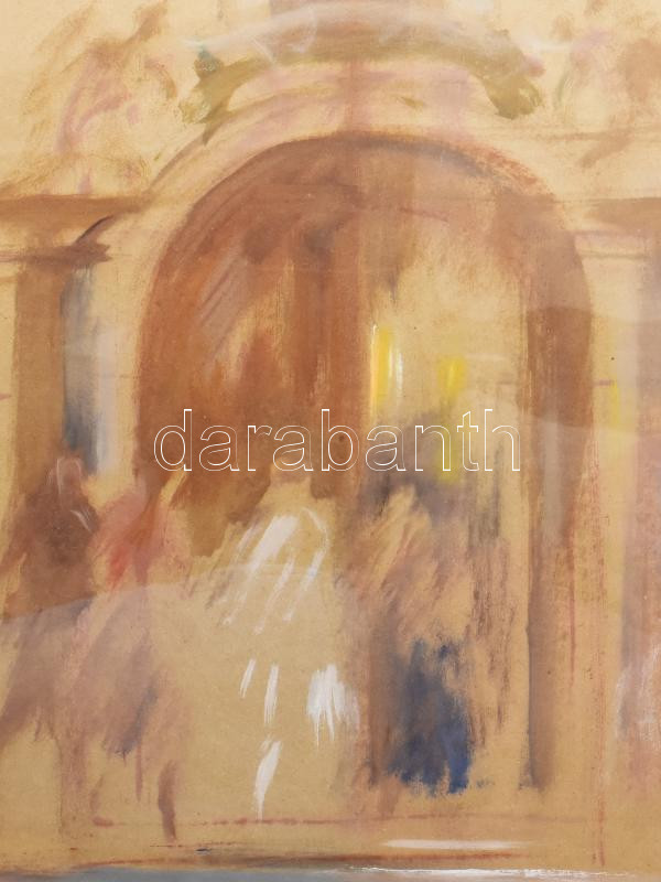 Leírás: Kristófi János (1925-): Hölgy templomkapunál. Akvarell, papír, jjl.: Kristófi 91. 70x50 cm, keretben, üvegezett, kis sérüléssel.