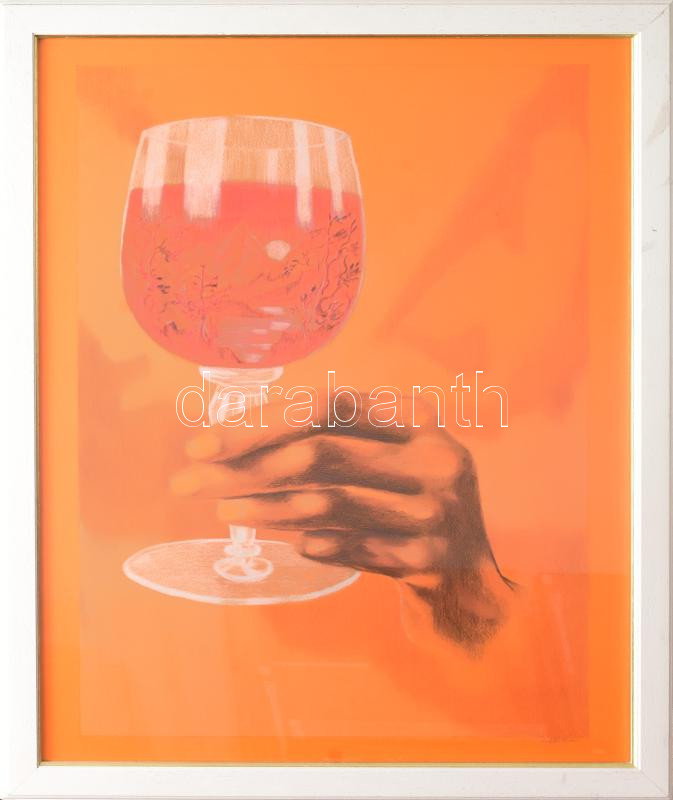 Leírás: Pohlotka jelzéssel: Szürreális borospohár. Vegyes technika, papír, 59x42 cm, keretben, üvegezett, jó állapotú.