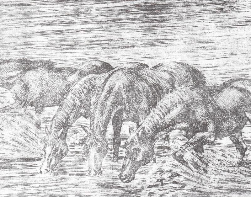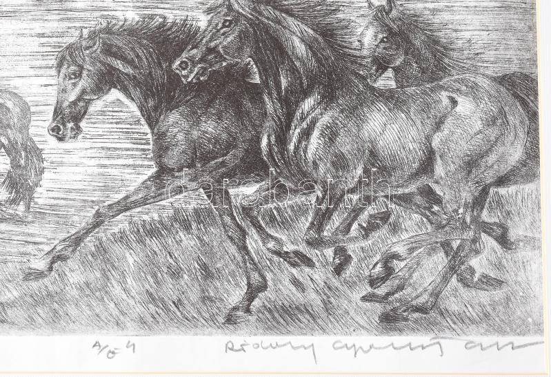 Leírás: Rádóczy Gyarmathy Gábor (1943-): Itatás. Rézkarc, papír, Jjl.: Rádóczy Gyarmathy G. A/E. 32,5x43 cm, nincs keret.