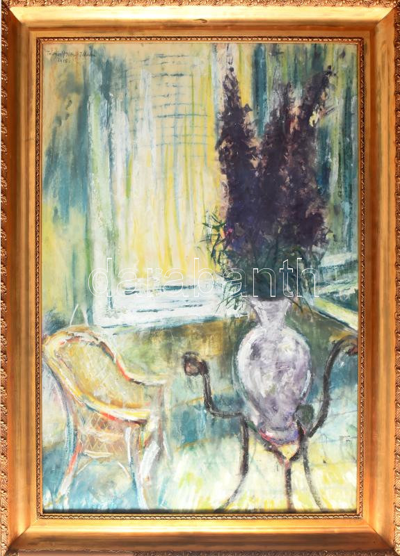 Tóvári Tóth István (1909-2004): Ablakos csendélet. tempera, papír, jbf.: Tóvári:/Tóth/:István 1956. 95x64 cm, keretezett, üvegezett, sérült. KIZÁRÓLAG SZEMÉLYES ÁTVÉTEL, NEM POSTÁZZUK! / ONLY PERSONAL COLLECTION IN OUR OFFICE!