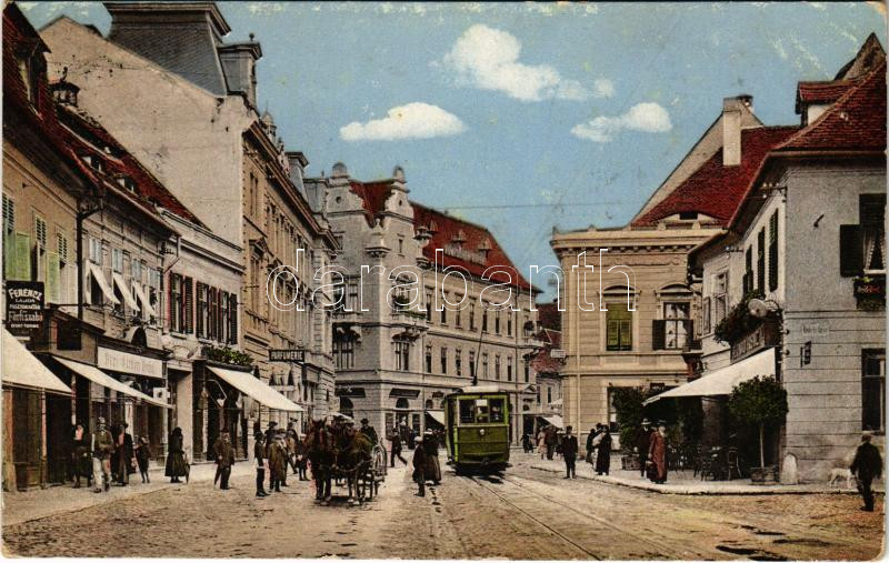 1913 Nagyszeben, Hermannstadt, Sibiu; Disznódi utca, villamos, Három Tölgy söröző, Ferencz Lajos posztóraktára, illatszertár, Római Császár szálloda, üzletek. Karl Graef / Heltauergasse, Drei Eichen Bräu, Honterusgasse / street, shops, tram, hotel, beer hall, perfumery (EK)