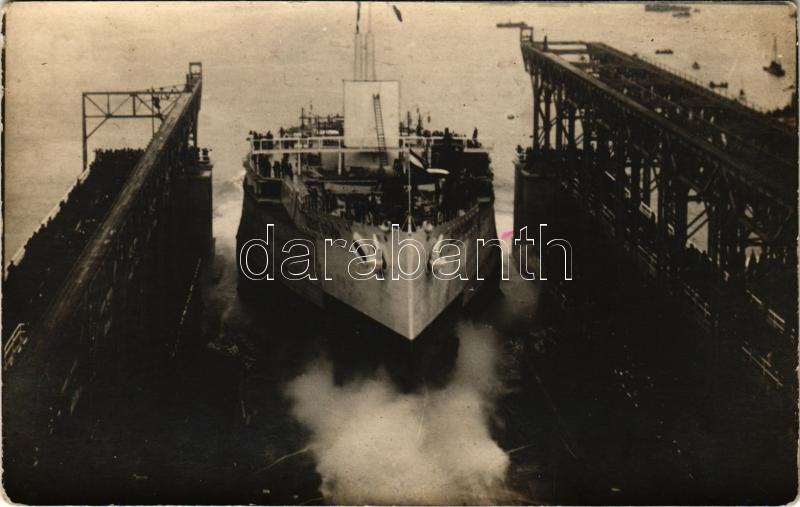 Leírás: 1914 Fiume, Rijeka; SMS SZENT ISTVÁN osztrák-magyar haditengerészet Tegetthoff-osztályú csatahajó vízre bocsájtása / K.u.k. Kriegsmarine Stapellauf / launching ceremony of an Austro-Hungarian Navy dreadnought battleship. photo (fl)