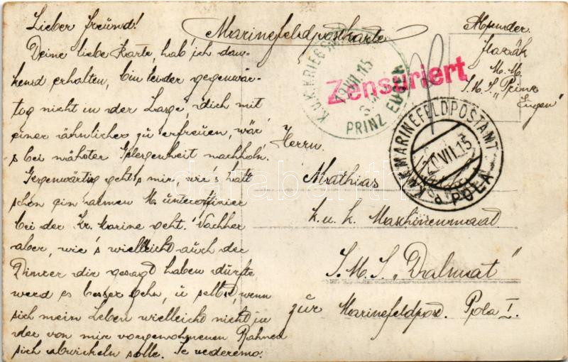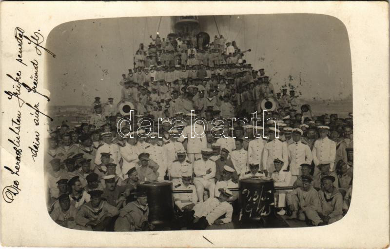 1915 SMS PRINZ EUGEN Osztrák-Magyar Haditengerészet pre-dreadnought csatahajó teljes legénysége a fedélzeten / K.u.K. Kriegsmarine / Austro-Hungarian Navy ironclad warship's mariners and Naval officers on deck. photo (fa)