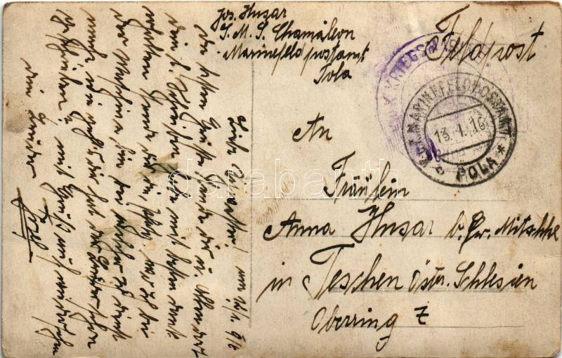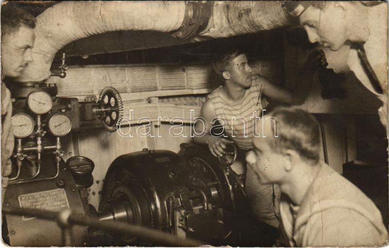 1916 K.u.K. Kriegsmarine SMS Chamäleon Minenleger, Matrosen / Osztrák-magyar matrózok az SMS Chamäleon aknarakó gépházának belsejében, gépészek egy cseh gőzturbinán dolgoznak / WWI Austro-Hungarian Navy minelayer, mariners working on a Czech steam turbine in the engine room. photo (fa) + "K.U.K. MARINEFELDPOSTAMT"