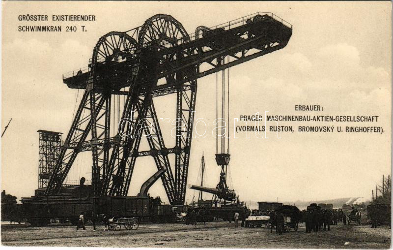 Pola, Grösster existierender Schwimmkran (Riesenschwimmkran) 240 T. / WWI Austro-Hungarian Navy, K.u.K. Kriegsmarine, the largest existing floating crane, crane ship in Pula, lifting up cannons, guns. Phot. Alois Beer. Verlag F. W. Schrinner.