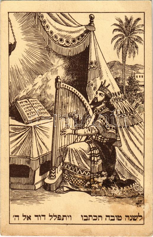 Leírás: Dávid zsidó király hárfán játszik, újévi üdvözlet héber nyelven / Jewish New Year greeting in Hebrew (EK)
