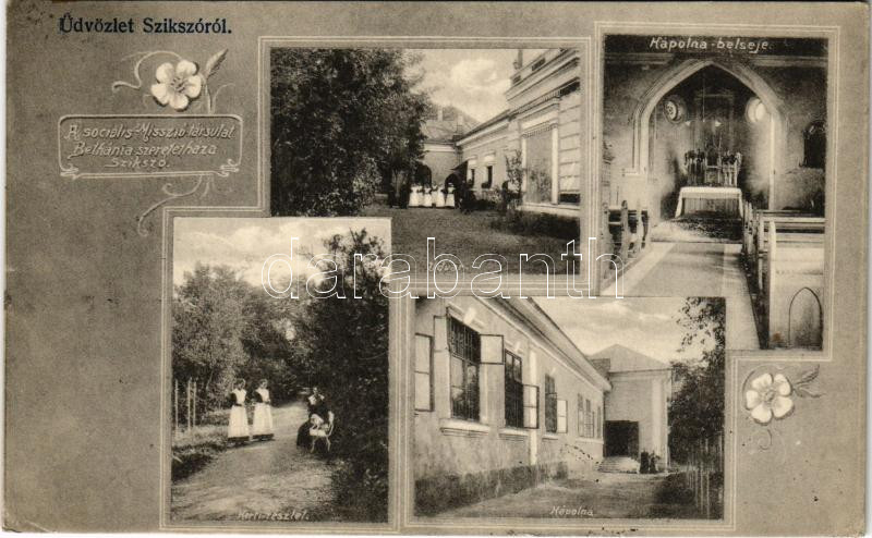Leírás: 1911 Szikszó, A Szociális Misszió Társulat Bethánia szeretetháza, belső, udvar, kápolna, kert. Art Nouveau, floral, Stamberger Márk kiadása (EK)