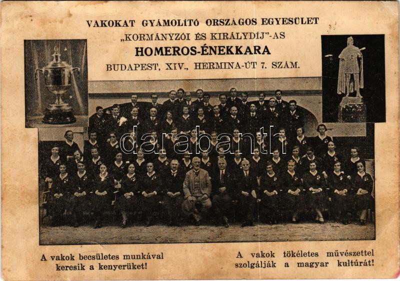 Leírás: Budapest XIV. Vakokat Gyámolító Országos Egyesület "Kormányzói és Királydíj"-as Homeros-Énekkara. Hermina út 7. (fl)