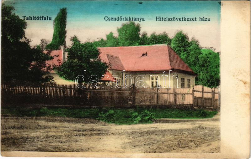 Leírás: Tahi, Tahitótfalu; Csendőrlaktanya, Hitelszövetkezet háza. Fogyasztási szövetkezet kiadása (fl)