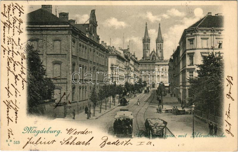 Leírás: 1898 (Vorläufer) Magdeburg, Wilhelmstrasse mit Ulrichskirche / street view, tram, church