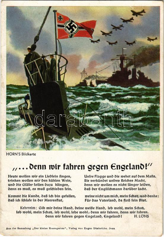 ... Denn wir fahren gegen Engeland! 12 Horn's Bildkarte / Második világháborús német náci hadihajós propaganda horogkeresztes zászlóval / WWII German Nazi Navy propaganda with swastika flag (Rb)