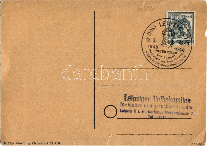 1848-1948 - 100 Jahre Kampf um die deutsche Einheit. Abteilung Röderdruck / 100th anniversary of the German revolutions of 1848-1849, propaganda + So. Stpl (tears)