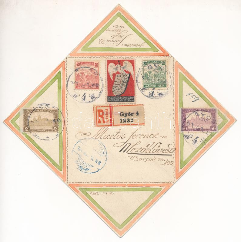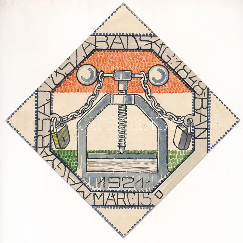 1921 Március 15. - Magyar Szabadság 1848-ban - Schima András (1882-1959) győri iparművész rajza és saját levele Martos Ferencnek címezve Mezőkövesdre / Hungarian hand drawn propaganda art s: Schima Bandi (13,7 x 13,7 cm) (EK)