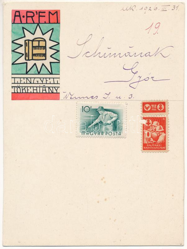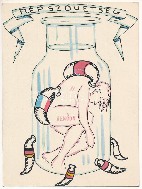 1926 Népszövetség - A Rém Lengyel Tőkehiány - Schima András (1882-1959) győri iparművész rajza és saját levele Győrbe címezve / Hungarian hand drawn propaganda art s: Schima Bandi (17,8 x 13,2 cm)